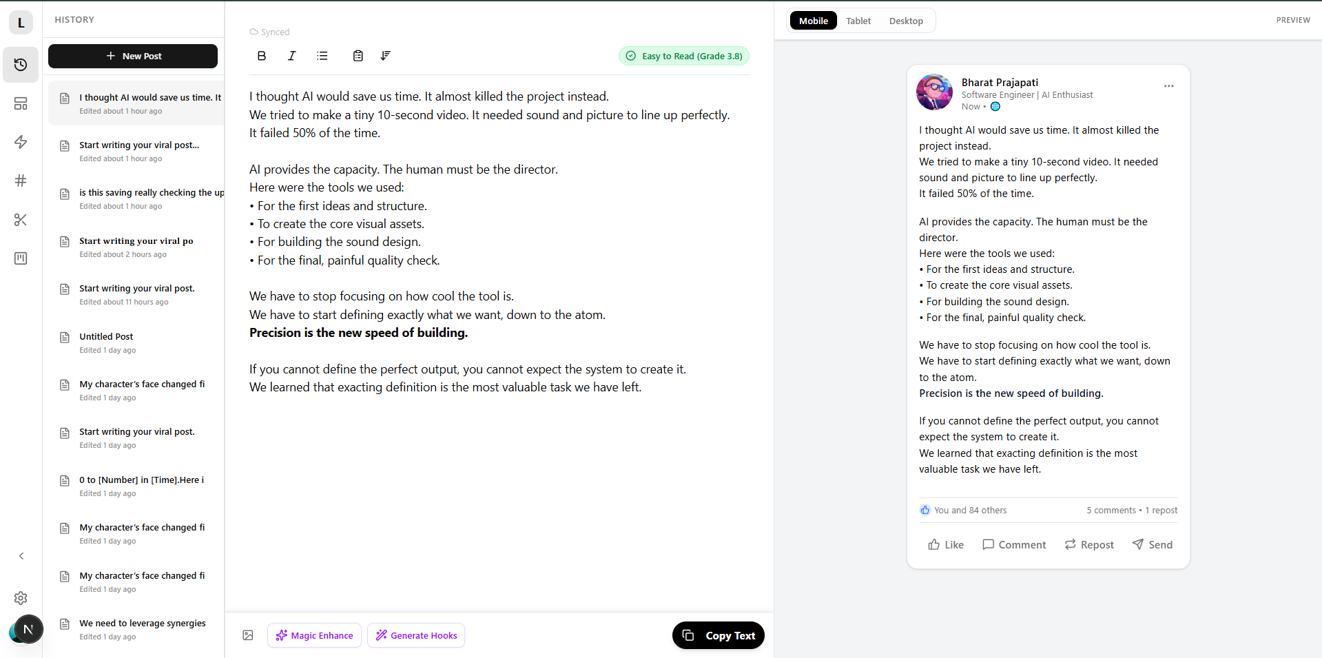 Most views come from mobile. Toggle between Phone and Laptop views instantly to ensure your formatting hits hard on every screen.